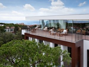За то, чтобы побаловать наше зрение, отвечает в первую очередь вид, который открывается из всех номеров отеля, но в особенности — с террасы на крыше 67 Sky Lounge Bar. Море и горные вершины Апуанских Альп, покрытых снежными шапками, производят сильнейшее впечатление. Да и территория отеля, которую можно увидеть через панорамные окна, безусловно, радует глаз: пышный сад, площадка с бассейном. В интерьерах используется много стекла для создания эффекта легкости и прозрачности. Все это создает ощущение единого открытого пространства.