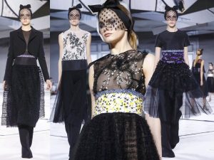 Основным цветовым сочетанием модельер выбрал черно-белую классику, «смягчив» контраст полупрозрачными тканями и многослойностью. Брюки легко соседствуют с короткими юбками, цветочный принт — с «гусиными лапками». Ретро-настроение создают вуали и страусовые перья, уравновешивают их короткие платья и жакеты из плотных, держащих форму тканей, не давая забыть — на дворе год 2015-й, и леди почти сплошь железные.
