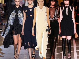 Последние несколько лет Рикардо Тиши увлекался уличной модой, однако в новом сезоне дизайнер решил вернуться к истокам, сделав ставку на агрессивную сексуальность и чувственность на грани с вульгарностью (не зря в первом ряду сидела Ким Кардашьян в гипюре). Вместо толстовок — летящие топы с прозрачными вставками и мини-платья из кружева и шнуровок, которые дизайнер предлагает дополнять сапогами-ботфортами с открытыми мысками, грубыми поясами и сумками через плечо. Каких только источников вдохновения не предполагали критики! Одни называли Жанну Д’Арк, другие — сериал «Игра престолов», в то время как третьи упорно настаивали на цыганских мотивах. На самом же деле Тиши обратился к тирольскому национальному костюму, винтажным игровым автоматам и его собственным первым работам для марки, сделанным почти десятилетие назад.