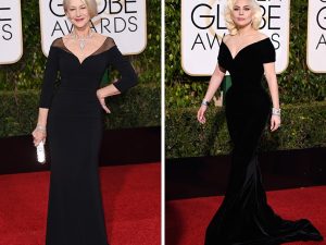 Джейми Александер выбрала необычное черно-зеленое платье из новой весенне-летней коллекции Genny с геометричным узором, глубоким вырезом и пышной юбкой. Хелен Миррен в очередной раз доказала, что даже в семьдесят лет можно выглядеть просто потрясающе: для церемонии «Золотой глобус-2016» она выбрала черное платье по фигуре простого кроя от дизайнерского дуэта Badgley Mischka. Чтобы образ не получился слишком строгим, британская актриса дополнила его ярким серебряным клатчем и элегантными украшениями.