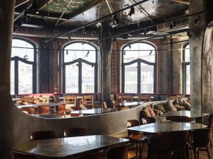 «Горыныч» открылся в помещении Центрального рынка, на верхнем уровне, в огромном полукруглом пространстве с видом на Трубную площадь. Само по себе помещение безупречно для любого проекта: высокие потолки, большие окна, панорамный вид, закаты… Что еще пожелать? Мечта ресторатора!