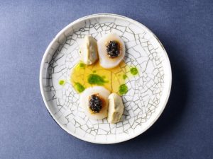 Жереми Урюти смешивает морского гребешка с устрицей и скромно заправляет все черной икрой.