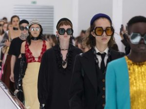 Как и все последние шоу бренда, этот показ, проходивший в пространстве Gucci Hub в Милане, был тщательно срежиссирован: Микеле противопоставил ярким и артистическим образам, воспевающим самовыражение, нормативную одежду и униформу, навязываемую социальными институтами, в очередной раз продемонстрировав свое презрение к любым рамкам и ограничениям свободы личности.