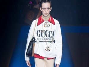 В этом сезоне показ Gucci открыл Неделю моды в Милане. Торжественное событие, в рамках которого было представлено 107 (!) луков — как женских, так и мужских, но все больше универсальных, развернулось в офисном пространстве Gucci Hab, расположенном на бывшей аэростроительной мануфактуре. Продолжая размывать гендерные границы, Микеле творит унисекс-культуру, облачая девушек в широкоплечие жакеты, бомберы и бесформенные кардиганы, а хрупких бледных юношей с длинными волосами, выглядящих выпускниками химфака на фестивале бардовской песни, в ультракороткие шорты, блузки с бантами и даже юбки-плиссе. Тех и других он увешивает бусами, браслетами и различными амулетами, прячет глаза за очками, а туфли предлагает носить непременно в сочетании со спущенными чулками. В новой коллекции, как, впрочем, и в предыдущих, нет генеральной линии (если не считать за нее очевидное восхищение 1970-ми), зато есть масса культурных кодов и различных аллюзий. Тут и сумка, дублирующая обложку сингла Элтона Джона, и свитер с вышивкой Never marry a Mitford («Никогда не женитесь на Митфордах»), отсылающий к аналогичным пуловерам, подаренным герцогом Эндрю своим братьям как предупреждение, и цирковые костюмы акробаток, и куртки в духе раннего Пресли, и вышитые герои Диснея, и «бабушкины» спортивные костюмы, и… В общем, дизайнер вновь замешал насыщенный дурманящий коктейль, в который «уложил» слоями самые противоречивые ингредиенты, почерпнув их из разных стран и эпох. Звонкими акцентами в этом сложносочиненном миксе выступают сверкающие пайетки, бодрящие не хуже шампанского, и богатые вышивки с инкрустациями, пьянящие как абсент.