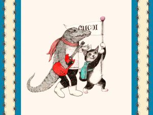 Итальянский модный дом Gucci в рамках презентации детской круизной коллекции представил раскраску с рисунками японской художницы и иллюстратора детских книг Юко Хигучи — поклонницы фантазийных персонажей и человекообразных котов. Именно она отвечала за принты для обуви, сумок и аксессуаров в детской коллекции этого сезона.