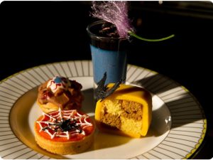 Шеф-кондитер Кимберли Лин-Маккартни и ее команда решили нарушить вековые правила: помимо богатого выбора чаев, традиционных английских сэндвичей и теплых сконов с домашними джемами и топлеными сливками, в меню появились тематические десерты, посвященные любимым мистическим персонажам и их магическим символам. Как вам идея заказать на десерт малиновый макарун «Ведьмин колпак» или отведать мусс из черной смородины с желе чернильного цвета под названием «Метла»? Традиционный английский бисквит «Баттенберг» с марципановой глазурью и характерной шахматной начинкой по случаю Хэллоуина украсят летучие мыши. Наши фавориты в меню — тыквенный тарт The Spider’s Tart с творожным кремом, яблочный пирог The Frankenstein и шоколадная сливочная помадка с лаймовым кремом The Poisonous Mushroom.