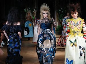 Один из самых эффектных образов Недели высокой моды — платье для сиамских близнецов от марки Guo Pei. Коллекция вдохновлена эстетикой бродячих цирков, благодаря чему в ней появились расшитые перьями и блестками трико, платья с аппликациями, имитирующими кукольный театр и изображающими сценки из жизни животных-артистов, оригинальные наряды на каркасе-обруче, пышные воротники и сверкающие инкрустации, а также азиатские мотивы и магические символы.