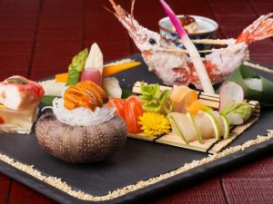 — Кайсэки «Весна»: маринованная дорада в листьях бамбука, японская креветка в соли, морской ёж, краб с желе из имбиря и ягод юзу, маринованный тофу с красной икрой, молодые овощи в традиционном японском бульоне даси, сашими: с желтохвостом, лососем, сахалинскими гребешками.