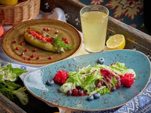 В заведении с грузинской кухней «Тинатин» в гастросет входит салат из спелых овощей с орехами, сочные хинкали с телятиной, нежный слоеный пеновани с сыром, тающий во рту медовик и полезный и вкусный клюквенный морс.
