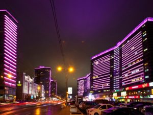Всю последнюю неделю высотные здания вдоль улицы Новый Арбат подсвечены розовым светом.