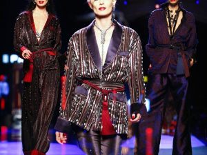 На этот раз коллекцию можно назвать сдержанной: мы не увидели свойственной Готье провокации, эпатажная натура мастера была заметна разве что в мелочах. Так, например, внимание привлекали к себе «вышибалы» у дверей, курящий прямо на подиуме, и яркий макияж моделей, примеривших на себя образы хищных светских львиц. Готье показал нам ночную жизнь глазами модной тусовки: брючные костюмы из струящегося шелка, длинные переливающиеся жакеты-халаты, кожаные куртки, ботинки, декорированные тысячами сверкающих страз, — такие образы мы могли бы увидеть как тридцать лет в популярном нью-йоркском диско-клубе, так и сегодня на дорогой вечеринке в центре Парижа.