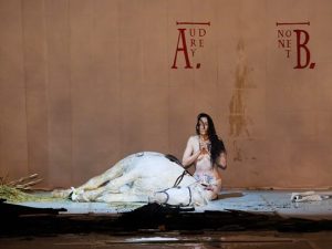 Драматическая оратория Артюра Онеггера на либретто поэта Поля Клоделя впервые была представлена публике в концертном исполнении в 1938 году, главную роль исполняла Ида Рубинштейн, которая, собственно, и предложила композитору написать ораторию под впечатлением от одного студенческого спектакля в Сорбонне в духе средневековых мистерий. В постановке Кастеллуччи Жанну играет феноменальная Одри Бонне — это она перевоплощается из уборщика в Орлеанскую деву, что видит святых и слышит голоса, призывающие ее спасти Францию. По Клоделю, «вершина жизни Жанны д’Арк — смерть, костер в Руане». Здесь она, привязанная к столбу в ожидании аутодафе, ведет разговор с братом Домиником, который читает книгу ее жизни, — в этой роли выступает Дени Лаван, известный киноманам по фильмам Леоса Каракса. В постановке нет столба, этого традиционного атрибута мученичества: Кастеллуччи не иллюстративен, его театр глубоко символичен, это театр образа, поэтика которого произрастает из «низового», часто физиологичного: крови, костной пыли, даже экскрементов. Причисляемый к продолжателям традиции театра жестокости Антонена Арто, сам Ромео Кастеллуччи предпочитает избегать определений. В «Жанне на костре» нет того радикализма, который может быть отвергнут неподготовленным зрителем. Полностью обнажаясь на сцене, Жанна теряет свою телесность, превращаясь в образ ренессансной живописи. В то же время она оказывается нашей современницей, из плоти и крови, беззащитной в своей наготе перед миром. В ней частица каждого из нас. «Я не хочу умирать, — говорит она перед казнью. — Мне страшно». Она то и дело повторяет вопрос, который становится риторическим: за что? Почему этот суд, где у нее пытаются вырвать признание в ереси и колдовстве? «Объясни, брат Доминик, что я сделала?» Она не может понять, почему ее мучители верят в дьявола, но не верят в ангелов.