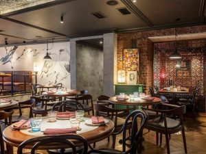 Интерьер разрабатывали, по признанию создателей, в стиле Китая 1920–1930-х годов. И действительно, привычной китайской, немного аляповатой для русского глаза обстановки нет и в помине: вы не встретите дешевых ярко-красных фонариков, крашенных под бронзу будд и драконов из папье-маше. Фактурная мебель, малахит и нефрит отсылают к антикварным лавкам. Все довольно сдержанно, в приглушенных тонах, с деликатными принтами на стенах и ровными цветами в отделке: смешали эстетство с модным приемом оголять историческую кирпичную кладку. Лофта, правда, не получилось, особенно с учетом китайских закусок, но и внимание на себя интерьер не перетягивает: он вышел спокойным и немного меланхоличным, что скорее идет в плюс ресторану. Хотя впечатлений на выходе оставляет совсем немного, зато не раздражает, не отвлекает и не создает визуального шума — в мегаполисе такие качества порой очень важны.
