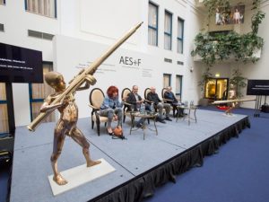 Лекция художников впервые прошла в отеле класса «люкс». Озаглавленная «Источники вдохновения: от Караваджо до рекламных образов», она рассказывала о том, что толкает автора на создание произведения и раскрывала подробности работы над разными изобразительными форматами. Слушатели узнали, как приемы Ренессанса и Барокко могут сочетаться с эстетикой кино и видеоигр, о составляющих собственного визуального языка AES+F: мифологии, новейших технологиях, фэшн-фотографии и advertising media.