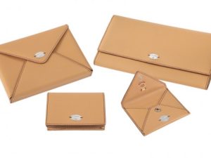 дорожное портмоне, визитница, папка для открыток и портмоне из кожи песочного цвета и декоративным тиснением — штампом с логотипом «ГУМ 120 лет».