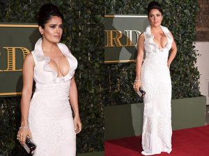 Соперничать с Николь Кидман за всеобщее внимание могла вчера разве что Сальма Хайек. 49-летняя актриса выглядела просто сногсшибательно в облегающем кремовом платье с глубоким декольте, высокой прической и с подобающим вечеру макияжем. Настоящая дива!