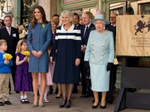 1 марта улица Пикадилли расстелилась перед представительницами сразу трех поколений британского двора: пока принц Уильям отбывает службу на Фолклендских островах, Кейт «отбывает службу» в женской компании. Весну герцогиня встречала в ярком синем пальто от итальянского брэнда Missoni и нежных туфельках работы британца Руперта Сандерсона. В честь дня Святого Давида Кейт приколола к груди солнечные нарциссы.