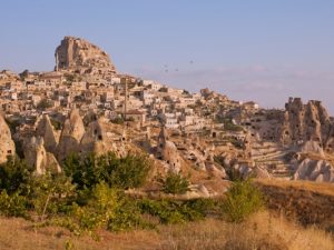 Передо мной, насколько хватает глаз, раскинулась, быть может, самая удивительная и необычная страна, которую мне довелось увидеть. Я нахожусь в Турции, в центральной ее части — Анатолии. Еще вчера меня развлекал своими огнями и базарами Стамбул — Константинополь, а сегодня я уже в совершенно другом мире, в другой реальности… Когда-то здесь было море, потом бушевали вулканы, извергая миллионы тонн пепла и лавы. Потом — ветер. Веками этот талантливый скульптор вытачивал свои шедевры в мягких вулканических породах, обнажая пирамидальные шпили. Обильные дожди довершали работу. В памяти возникают картинки из пушкинской сказки, где 33 богатыря медленно появляются из пучины: сначала — головы, увенчанные остроконечными шлемами, затем — плечи, затем — широкая грудь в кольчуге. И вот все готово. Перед нами — целая страна с сотнями ущелий и долин, заполненных ровными рядами туфовых великанов, достигающих в высоту до 30 метров, остроконечных или в темных базальтовых шапках, взбирающихся по крутым утесам или притаившихся в узких каньонах. Совершенно сказочные, инопланетные ландшафты…