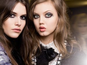 Визажисты шоу сместили акцент на глаза: дымчатый мэйкап повторяет форму глаз, создавая хрупкий девичий образ, или вытягивается на манер стрелок, придавая внешности хищные черты. Необычная трактовка smoky eyes едва ли подойдет в качестве повседневного макияжа, а вот на вечеринке или рок-концерте вам не будет равных! Непременный атрибут такого макияжа — идеально ровная, матовая и словно бы светящаяся изнутри кожа. Для показа Chanel лица моделей сначала подготовили уходовыми продуктами: на кожу вокруг глаз нанесли гель Hydra Beauty Gel Yeux, увлажнили кожу сывороткой Hydra Beauty Micro Serum и завершили подготовку кремом для лица из той же линии.