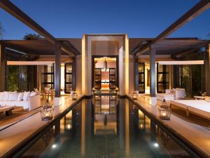 В каждой из 54 вилл — собственный бассейн и сад, в люксах — просторные террасы с видом на заснеженные вершины гор Атлас и — в двух люксах из 9 — специальная комната для спа-процедур и свой собственный неглубокий бассейн.