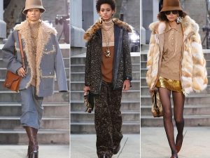 Большинство образов дополняли внушительные головные уборы: разнообразные шляпы (серые, черные, полосатые и с принтом под леопарда), шапки и стилизованные объемные бейсболки, повернутые козырьком назад — всего мы насчитали шесть разных дизайнов. Среди других аксессуаров можно отметить ботинки на высокой платформе и украшения. Крупные серьги, золотые цепи с подвесками в виде ключей и перстни прекрасно вписались бы в гардероб рэп-исполнителя конца 80-х — начала 90-х годов.
