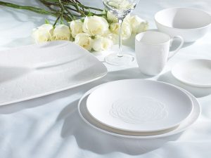 «Мы хотим воспроизвести в коллекции посуды ту же неповторимость и скрупулезную ручную работу, которые видны в наших платьях», — рассказывает Джорджина Чэпмен. А потому на изящных, кажущихся полупрозрачными предметах из костяного фарфора расцветают розы, тарелки покрывает вуаль узора, имитирующего тонкое кружево, а некоторую посуду украшает 24-каратное золото и платина. При этом ее можно мыть в посудомоечной машине!