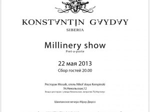 Коллекция посвящена отчаянным поклонницам скачек, где всеобщее внимание приковано к головным уборам дам. Смелые имиджевые решения дизайнера воплотились в элегантных линиях и малых формах. Гайдай использует длинные невесомые перья ярких цветов и декоративные цветы, ставшие визитной карточкой бренда.