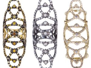 Возможно, верна и обратная связь, и ваша жизнь станет ярче, если вы решитесь украсить ее нестандартным дизайном? Тем более, что новая линия украшений Loree Rodkin в стилистике body jewellery с изящными кольцами из золота и бриллиантов, предлагает и более скромную, «облегченную» версию культовых бондажных колец и колец cigar band. Для начинающих.