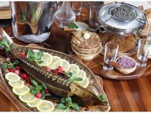 Полный цикл роста стерляди, от мальков до взрослой особи, тщательно отслеживается, а в процессе выращивания используется только французский корм натурального происхождения. На ваш стол деликатес подают слегка присоленным, на ледяном плато и в «богатой» компании национальных закусок. Приглашайте «ловить золотую рыбку» своих партнеров и вам обязательно повезет.