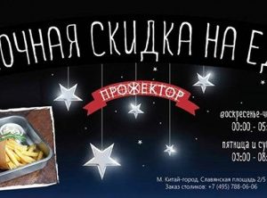 После бурной вечеринки всегда актуален вопрос ночной трапезы: кухня большинства заведений закрыта и натанцевавшегося путника могут угостить разве что чипсами или готовым сэндвичем из упаковки. К счастью, в «Прожекторе» «клабберов» любят и готовы потчевать вкусной едой даже ночью — причем, с 50% скидкой! «„Прожектор“ работает 24 часа в сутки, и мы всегда рады гостям, во сколько бы они к нам не пришли. Мигрировать из заведения в заведение — давняя привычка москвичей, это ни для кого не секрет. Вдоволь натанцевавшись в каком-то клубе, люди обычно срываются с места и перемещаются в другое — пообщаться, позавтракать, еще немного выпить. Мы просто хотим, чтобы во время этого общения люди чувствовали себя комфортно и судорожно не пересчитывали оставшуюся наличность», — рассказывает о предложении совладелец заведения Александр Кан.