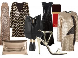 Во-вторых, правильно подберите аксессуары. Простые контрастные туфли и сумки помогут добавить к образу элемент простого шика. Кожаные аксессуары, декорированные заклепками, помогут задать рокерское настроение. Ну а если в новогоднюю ночь для вас срабатывает правило «слишком яркими могут быть только звезды», дополните ваше платье клатчем и босоножками из металлизированной кожи в тон. Кстати, еще пару лет назад подобный смелый шаг модные эксперты вряд ли бы одобрили, но в последнее время наслоение и смешение блестящих элементов стало весьма актуальным. Этот тренд мы не оставим в уходящем году, а возьмем с собой в новый: пайетки и металлик будут одной из ведущих тенденций сезона весна-лето 2016.