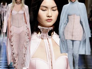Креативный директор Balmain отошел от красно-золотой гаммы и сделал ставку на пастельные оттенки: нежно-голубой и молочно-розовый сочетались с бежевым, зеленым и черным. Среди самых запоминающихся образов можно отметить расшитые платья, украшенные декоративными кистями из шелковых нитей, — их в коллекции было несколько. Что касается аксессуаров, то в грядущем сезоне Рустен предлагает нам носить ультра-длинные замшевые ботфорты и стилизованные туфли-пилигримы на высокой шпильке. Из других деталей следует отметить широкие пояса поверх «корсетных» платьев и колье в виде металлических ошейников.