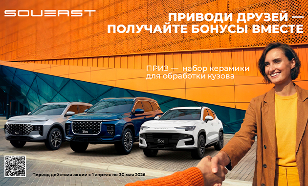 Продолжаем следить за новостями авторынка. Бренд Soueast перезапускает акцию «Приведи друга в семью Soueast», которая будет действовать до 30 мая 2026 года. Приняв участие в акции, клиенты получат набор для защиты кузова «Soueast Керамика» — профессиональный защитный состав для ухода за кузовом автомобиля. Для участия владельцу автомобиля Soueast необходимо перейти на страницу акции, зарегистрировать VIN-номер своего автомобиля и автомобиля своего знакомого, друга, родственника. И рекомендующий участник, и его «реферал» получат набор для защиты, а также услугу по нанесению керамического покрытия у официального дилера.
