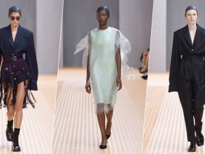 В центре внимания — не призрачные философские концепции, а мастерство швей и просто по-настоящему красивая одежда. Миучча Прада за кулисами шоу резюмировала: «Я устала от разговоров про идеи — давайте наконец поговорим про одежду». Солировали летящие платья (местами превращавшиеся в шарфы для брючных образов) и «юбки» из металлической бахромы. А главным хитом среди аксессуаров стали вечерние сумки, воспроизводящие форму, впервые разработанную в 1913 году, и декорированные милыми (или нет) резными фигурками.