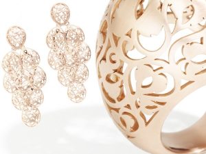 Поэтичный дизайн и легкий ажурный узор очаровывают, стоит только увидеть украшения Arabesque, а контраст крупных форматов, нежного плетения и нескромного блеска россыпи бриллиантов способен покорить любое женское сердце. Особого внимания заслуживают куполообразное кольцо с тонким кружевным орнаментом из розового золота, среди листьев и ветвей которого «притаились» 670 бриллиантов, и серьги-подвески, составленные из восьми «капелек» с тем же ажурным узором. А для «выхода в свет» ювелирами Pomellato создана созвучная модель серег, почти полностью закрывающая мочку уха и украшенная бриллиантами.
