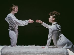 Григорьян еще больше усложняет повествование. Сначала режиссер вводит двух мужских персонажей — своеобразные тени (их исполнили инфернально притягательные Никита Ковтунов и Кирилл Одоевский), из уст которых и звучат те самые художественно важные ремарки. А затем еще и путает реплики между актерами, что окончательно отуманивает и даже будто душит зрителя. Но в этом, как и в незатейливом и вместе с тем мастерски придуманном пространстве спектакля, парадоксально текст становится легким и воздушным. И отнюдь не для помощи смотрящему, а для создания атмосферы медленного удушья, которой веет практически от каждого из диалогов или монологов «Пушечного мяса»: будь то история про отца одной из героинь, или пылкие отношения между двумя из них, или рефлексия на тему современного искусства.
