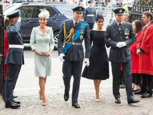 Не меньшее внимание, чем королева, привлекла «великолепная четверка», как теперь называют монарших отпрысков и их жен: герцогов Кембриджских и Сассекских. Для торжественного выхода Кэтрин облачилась в элегантное платье-пальто Alexander McQueen, дополненное брошью из алмазов и рубинов, подаренной ей как почетному коменданту ВВС, шляпкой Sean Barrett, замшевыми лодочками и вышитым клатчем, в то время как Меган Маркл сделала ставку на классический крой и беспроигрышный черный цвет платья Givenchy, изготовленного по индивидуальному эскизу Клэр Уэйт Келлер (по другой версии, авторство наряда приписывают модному дому Dior). Кроме того, на тожественную церемонию прибыли премьер-министр Великобритании Тереза Мэй, дочь Елизаветы II принцесса Анна и сыновья королевы принцы Эндрю и Эдвард. По завершении службы гостей торжества ждало грандиозное авиашоу с участием 100 самолетов, за которым члены монаршей фамилии наблюдали с балкона Букингемского дворца.