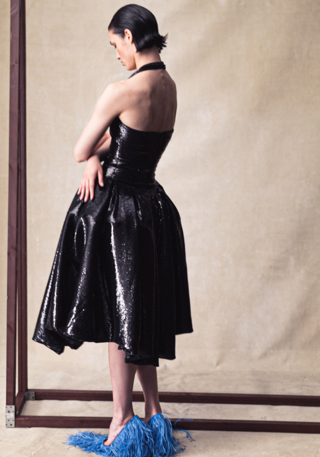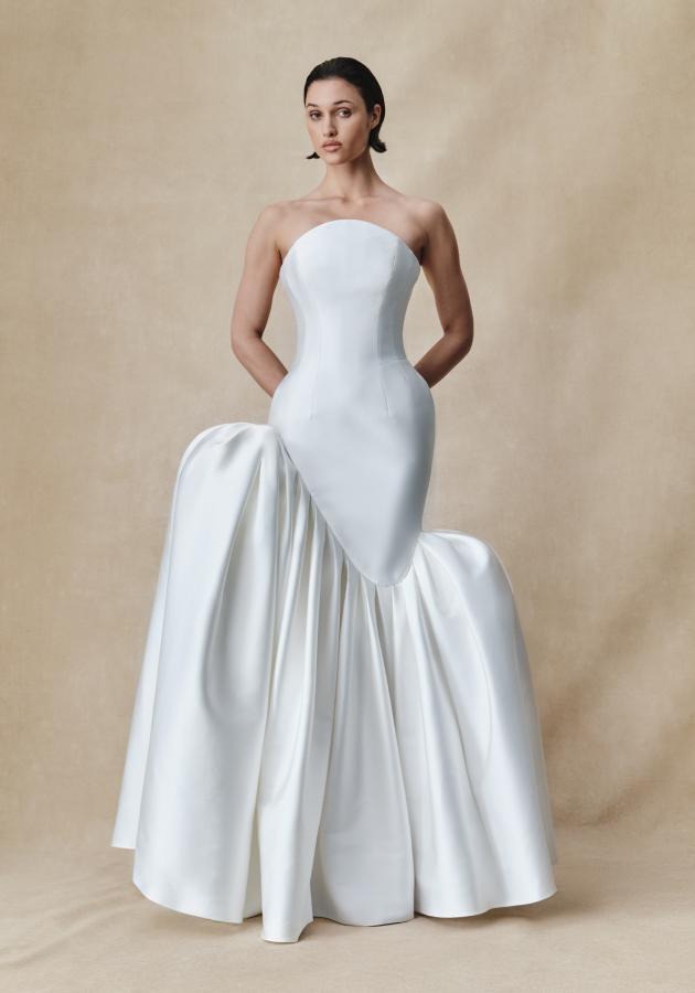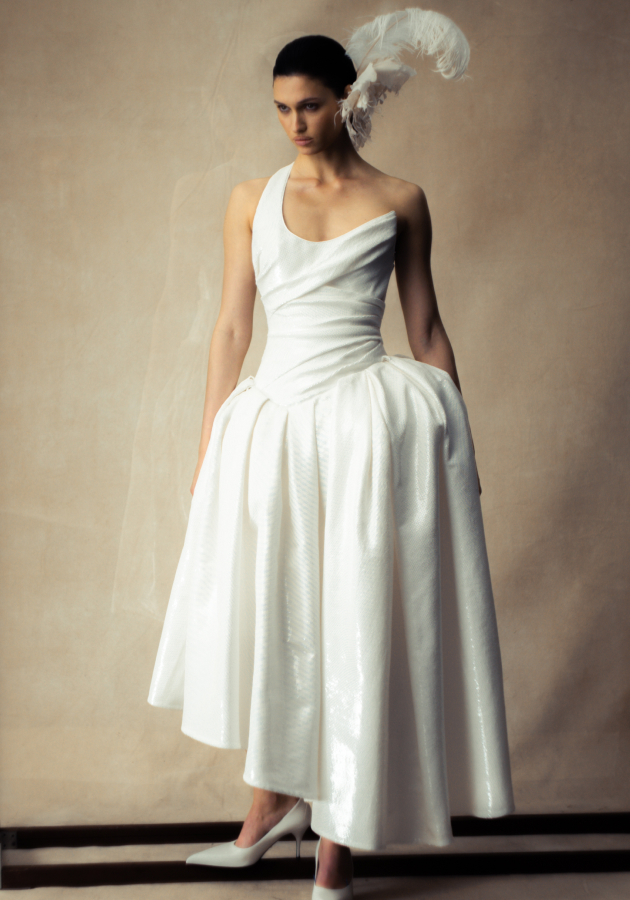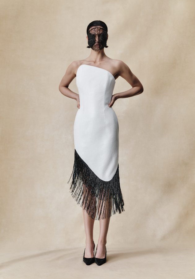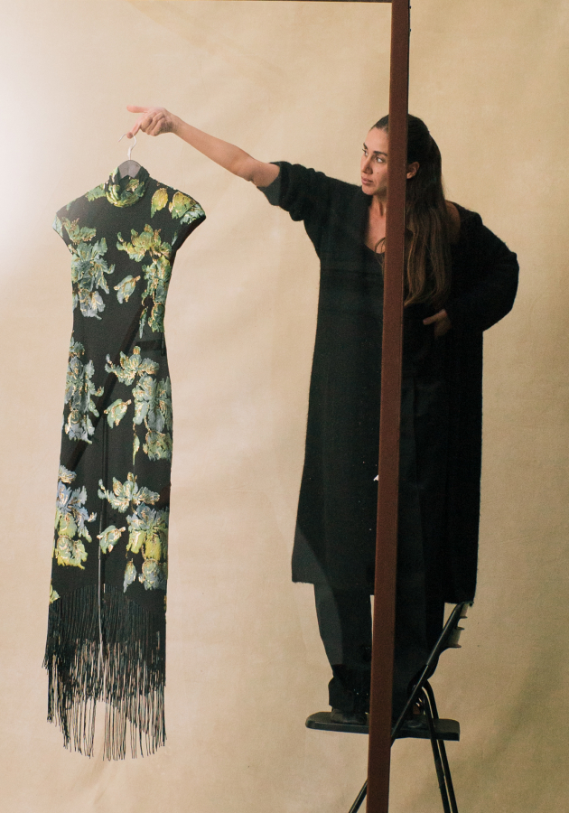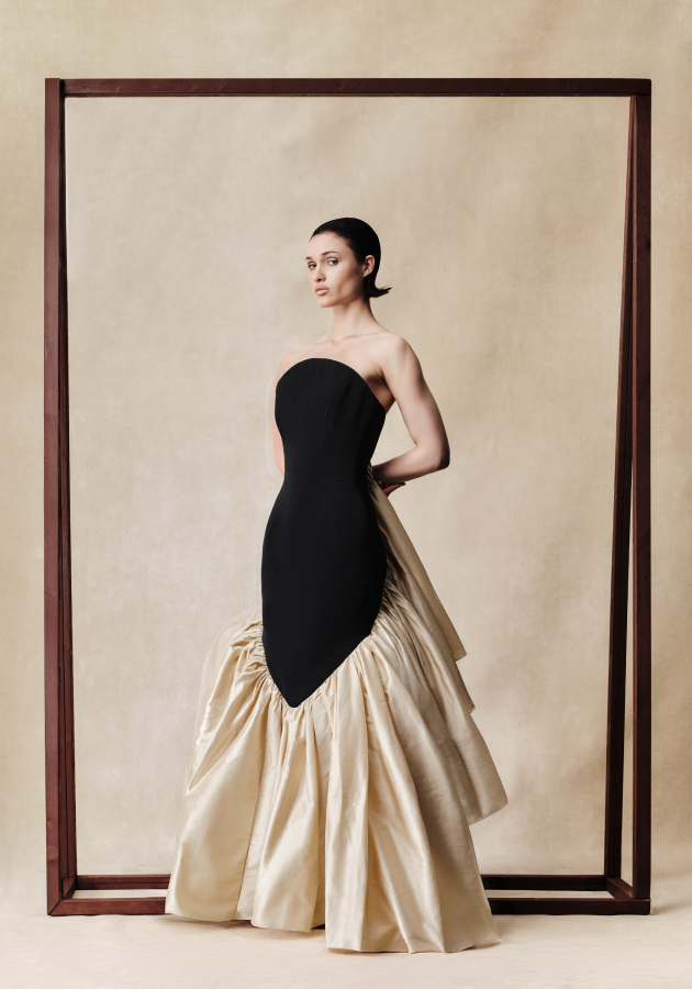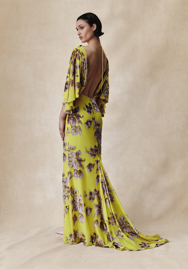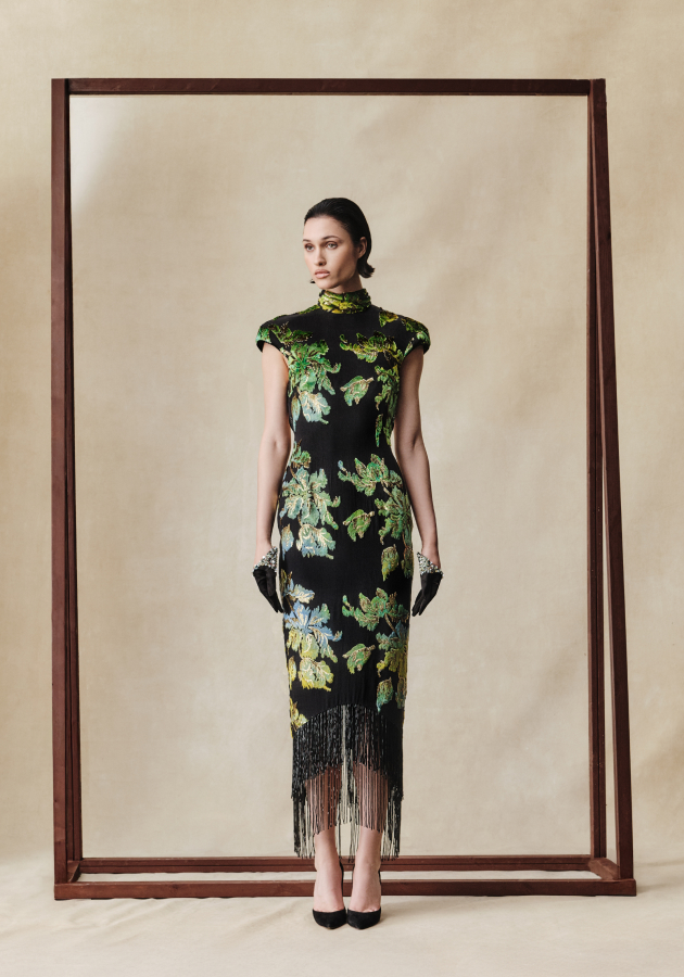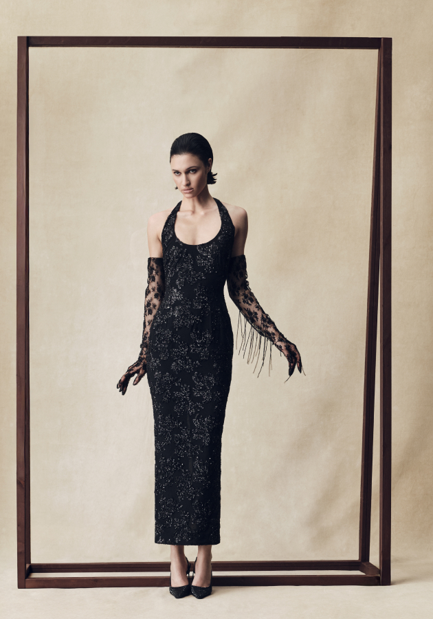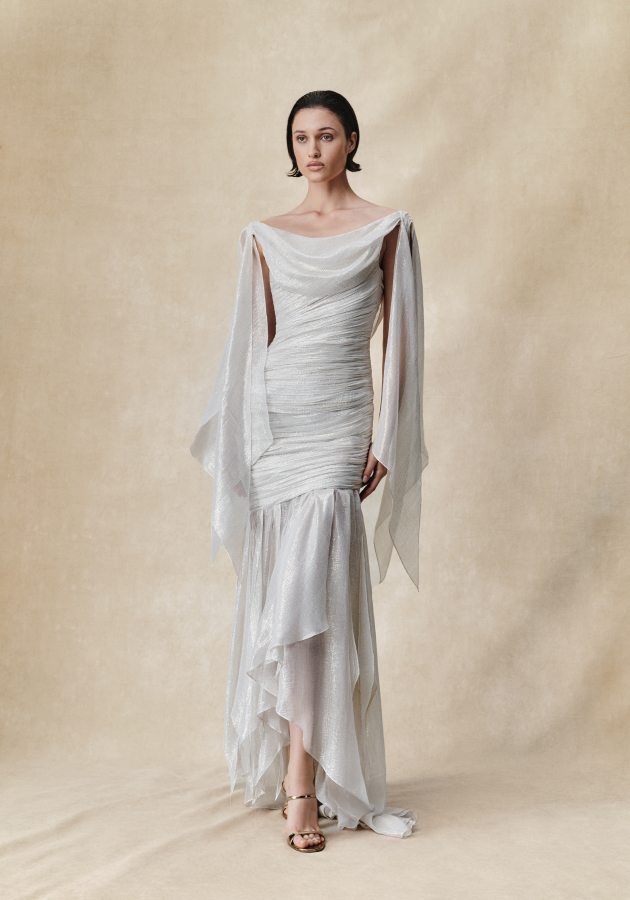 Главная «премьера» сезона — панбархат с мерцающими нитями. Материал «оживает» в движении, ловит свет и переливается — почти как покрытые пыльцой крылья бабочки. Силуэты становятся еще более утонченными и скульптурными: акцент на бедрах создает выразительный объем, а драпировки, давно ставшие визитной карточкой бренда, позволяют играть с пропорциями, отсылая к античной пластике и скульптуре. Деликатные складки, обрамляющие рукава, ненавязчиво напоминают о главной теме коллекции, превращая героиню в современную нимфу — в ней чувственность и мягкая сила существуют одновременно, дополняя друг друга.