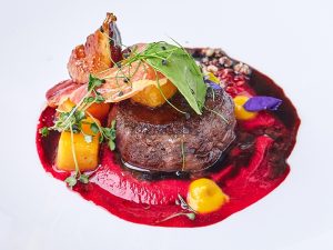 - Салат с перепелкой, мини-картофелем и муссом из свеклы