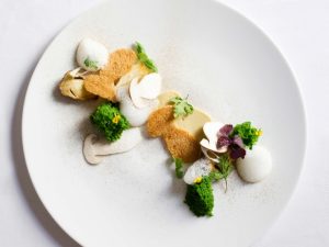 - Пряная треска, мидии, пюре из миндаля и цветной капусты, кориандр, мята и йогурт