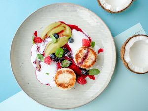 - Карпаччо из дыни с рикоттой и соусом из маракуйи