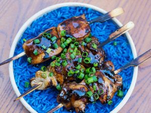 - Куриные шашлычки с синим рисом, кунжутным маслом, бурбоном, портвейном, соусом терияки и зеленым луком