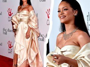 Для выхода в свет Рианна выбрала эффектное платье от Dior. Несмотря на блеск золота, образ певицы демонстрирует сдержанную элегантность: геометричная драпировка деликатно прикрывает глубокий разрез, а неизбежное внимание к декольте — в качестве украшения на шею Рианна выбрала массивное бриллиантовое колье — выводит из категории вызывающих объемная накидка в тон платью. Завершают по-настоящему блистательный образ изящные золотые туфли.