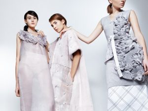 В основе новой коллекции — асимметричный крой, структурный декор, витиеватая отделка, выполненная вручную из многослойной гофрированной ткани наподобие техники оригами, и использование эффекта деграде в цветовых решениях. Сочетание на первый взгляд несовместимых между собой фактур и однотонных тканей с авторскими принтами позволяет дизайнерам развивать свои идеи и в русле классической моды, и в формате сложных кутюрных образов-конструкторов. Самые яркие примеры «модной комбинаторики» в исполнении сестер Рубан — трикотажный разноуровневый топ с фигурной вязкой, который становится частью юбки, и меховая баска-половинка, надетая поверх хлопкового жакета, превращающая повседневный лук в коктейльный наряд. В коллекции представлены платья-бюстье, юбки-карандаши, баски-половинки, приталенные пальто и жилеты, а также изделия из меха, созданные совместно с меховым домом Marusya, и линейка обуви ручной работы.