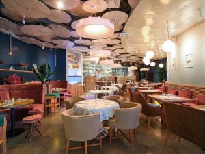Каким же заведение оказалось на поверку? Во-первых, ресторан стал, пожалуй, самым продуманным с точки зрения дизайна. С декором уже не так усердствовали и отделались лишь легкими штрихами: телефоном-лобстером, картинами ручной работы в виде белых объемных рыб. Глаз цепляется за безупречный нежно-голубой цвет стен, который настраивает на безмятежность и обеспечивает полный штиль в голове. В целом интерьер, над которым трудилось дизайн-бюро Владимира Перельмана I Like Design — как и на предыдущих проектах, получился куда более гармоничным и толковым, чем во всех других ресторанах компании. Конечно, все еще есть куда стремиться, но развитие дизайнерской мысли заметно.