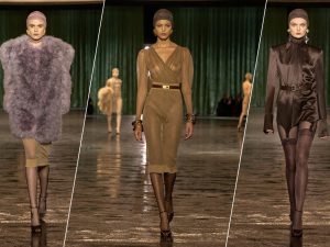 Энтони Ваккарелло вместе с Saint Laurent возвращает моду на прозрачные колготки и даже идет дальше — превращает телесный капрон в одежду! Новая коллекция — это почти 30 вариаций на тему транспарентных образов и облегающих силуэтов — скорее обнажающие, чем хоть что-то прикрывающие платья, топы, юбки. Из условно «зимних» образов в коллекции — только куртки в стиле бушлатов Сен-Лорана из 60-х, вдохновленных культурой битников. В общем, образы для смелых — и морозоустойчивых!
