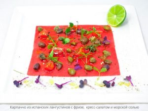 Среди гриль-вариаций обращают на себя внимание испанские лангустины с фризе и листьями салата, французские устрицы с листьями молодого шпината, голландским соусом и красной икрой, американские морские гребешки и даже индонезийские королевские креветки с пряными травами. Из «северной» экзотики — блюдо из камчатской корюшки — гостя северных морей. Она подается в обжаренном виде и на съедобной вафельной бумаге.
