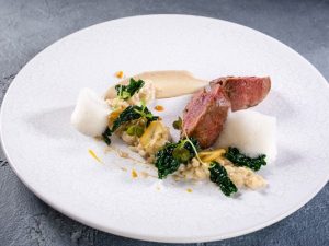 - Молочный теленок с рисом из крема белого трюфеля и кейлом