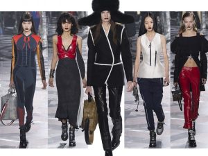 Нет никаких сомнений, что показ Louis Vuitton стал одним из самых ярких на этой Неделе моды во Франции. Пока остальные дизайнеры пытаются сделать ставку на необычный крой и диковинные акценты, Николя Гескьер представляет нам полноценный зимний гардероб — без излишнего эпатажа, однако с добавлением экстравагантных акцентов. На подиуме мы увидели спортивный шик в сочетании с небрежной элегантностью: особенно стоит отметить кожаные куртки в мотоциклетном стиле, которые соседствовали с шерстяными брюками, пальто классического прямого кроя и шелковые платья с кожаными вставками. Среди аксессуаров стоит отметить тяжелые ботинки, длинные перчатки и даже огромную шапку-ушанку в псевдорусском стиле. Экспрессивность зимней коллекции подчеркивали бьюти-образы моделей: визажисты Louis Vuitton сделали ставку на смелый акцент на губах, отдав предпочтение темно-бардовой помаде с еще более темным, почти черным, контуром.