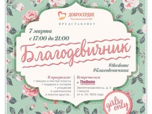 Гостей будут ждать угощения и напитки, beauty-зона, в которой можно будет сделать макияж, укладку и маникюр, и маркет с подарками к 8 Марта. Собранные на «Благодевичнике» средства будут направлены на программу реабилитации подопечных фонда «Добросердие», детей с ДЦП.